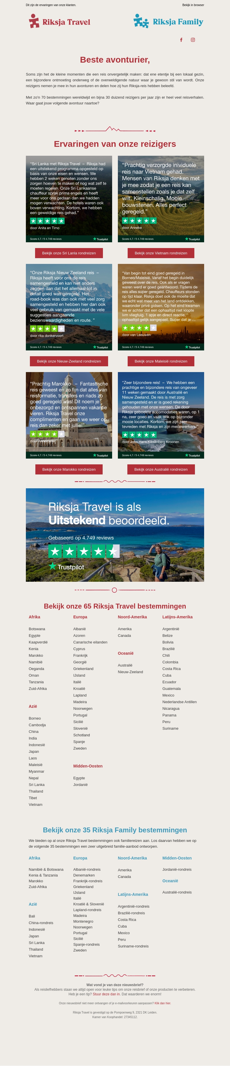 Riksja Travel presenteert inspirerende reiservaringen van eerdere reizigers. Kies uit meer dan 200 bestemmingen wereldwijd om jouw volgende droomreis te plannen. Of je nu een gezinsreis of een individuele reis wilt, Riksja Travel biedt unieke ervaringen aan. Beoordeeld als uitstekend op Trustpilot, zijn ze een betrouwbare keuze voor jouw avontuurlijke vakantie.