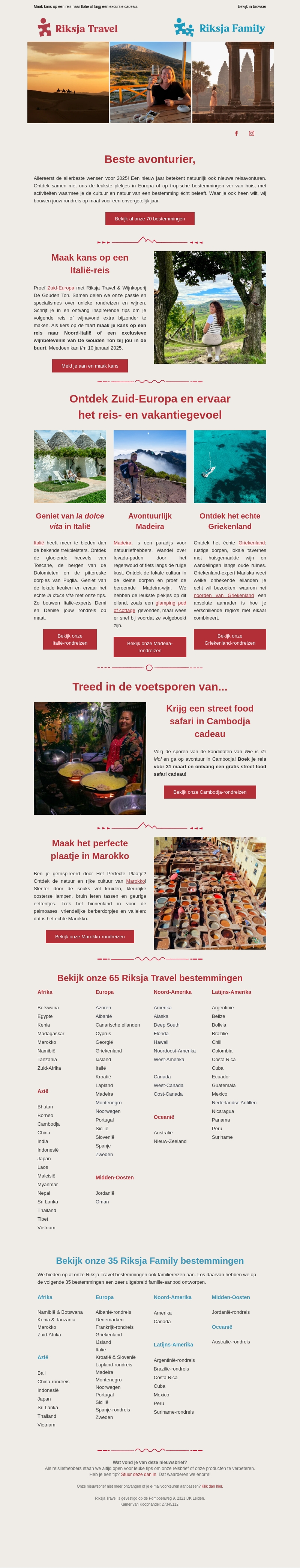 Riksja Travel inspireert je om te dromen over je volgende avontuur in 2025. Van de heuvels van Italië naar de adembenemende schoonheid van Madeira, en ontdekking van het echte Griekenland, er is een bestemming voor elke avonturier. Steden zoals Zuid-Europa bieden het perfecte vakantiegevoel. Kijk verder voor meer exclusieve reiservaringen.