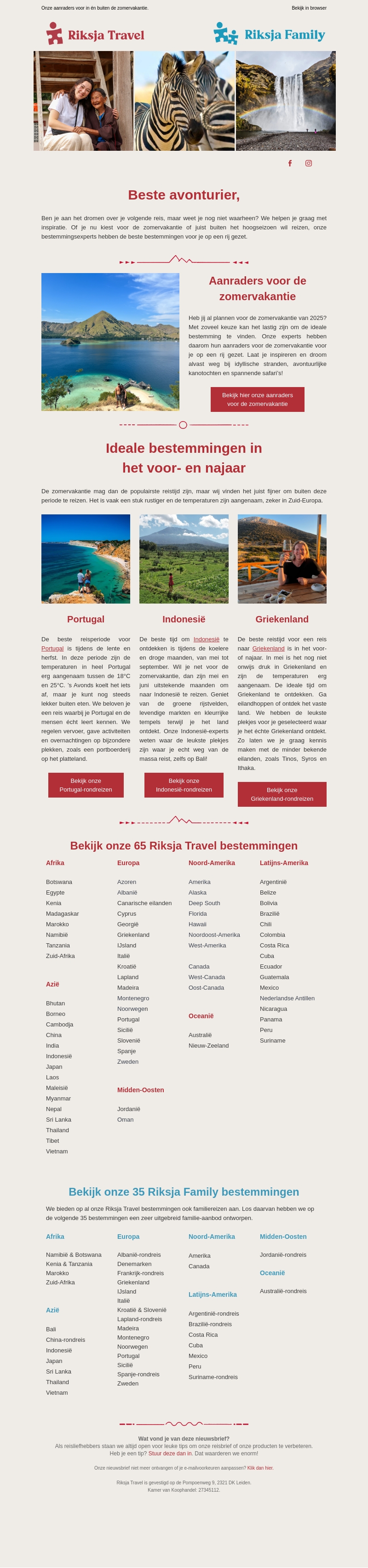 Ben je op zoek naar inspiratie voor je volgende zomervakantie? Riksja Travel helpt je bij het vinden van de perfecte bestemming. Of je nu droomt over een exotisch avontuur of een familievakantie binnen Europa, onze experts staan klaar om je te adviseren. Ontdek populaire reizen naar Portugal, Indonesië en Griekenland, en meer.