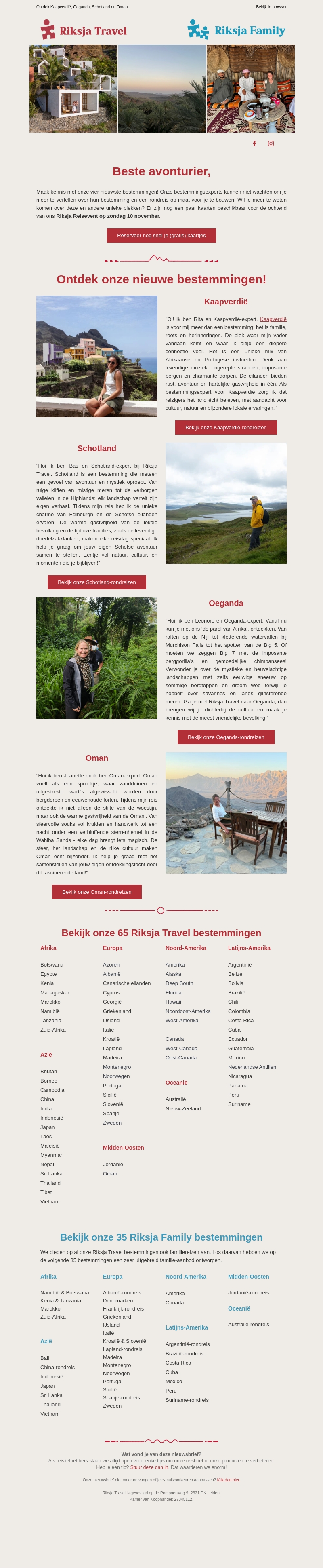 Riksja Travel nodigt je uit om vier nieuwe bestemmingen te ontdekken: Kaapverdië, Schotland, Oeganda en Oman. Ervaar de rijke culturen en adembenemende landschappen die deze plekken te bieden hebben. Of je nu op zoek bent naar avontuur of ontspanning, onze bestemmingen bieden voor ieder wat wils. Maak kennis met unieke ervaringen en laat je betoveren door de schoonheid van deze landen. Ontdek de mogelijkheden en plan jouw volgende reis.