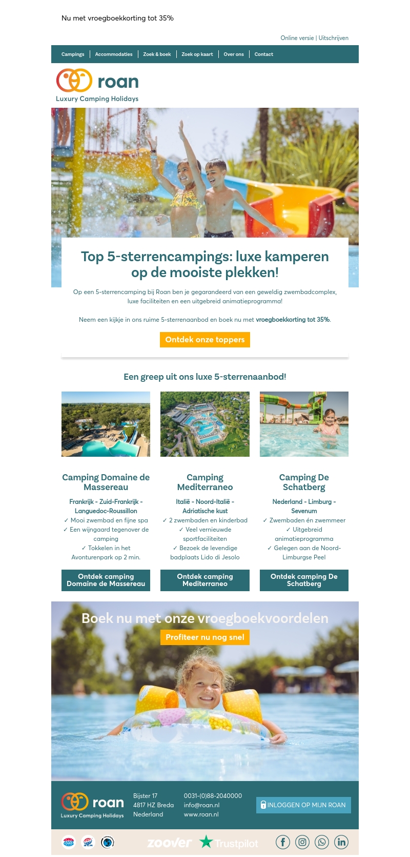 Op zoek naar een luxe kampeerervaring? Ontdek de top 5-sterrencampings bij Roan. Geniet van geweldige zwembaden, luxe faciliteiten en uitgebreide animatieprogramma's. Boek nu met vroegboekvoordeel tot 35% en verzeker jezelf van een onvergetelijke vakantie!