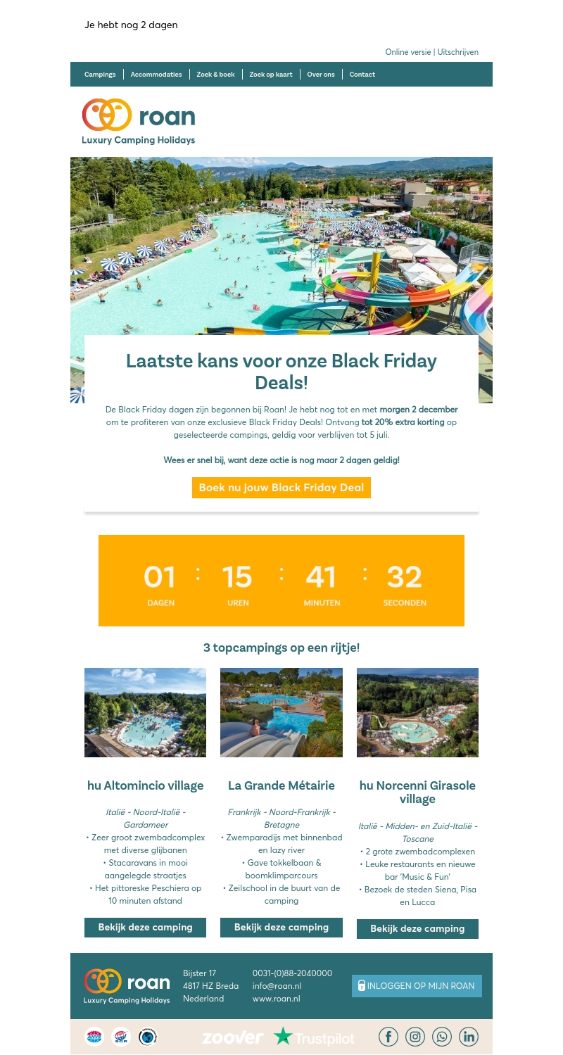 Profiteer van Roan's exclusieve Black Friday Deals en ontvang tot 20% korting op geselecteerde campings. Wees er snel bij, want deze actie geldt nog maar 2 dagen! Boek je volgende avontuurlijke vakantie bij één van onze fantastische locaties in Italië of Frankrijk.