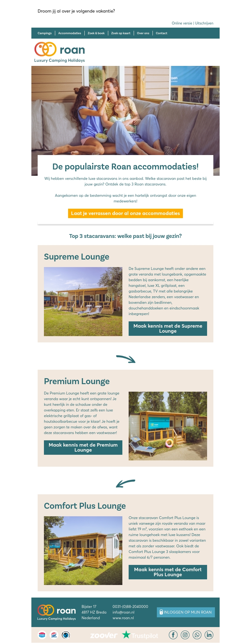 Roan Luxury Camping Holidays presenteert de drie populairste stacaravans. Ontdek de Supreme Lounge met luxe voorzieningen, de Premium Lounge voor ultiem comfort, en de ruime Comfort Plus Lounge. Elke caravan biedt unieke kenmerken en zorgt voor een onvergetelijke vakantie-ervaring voor het hele gezin.