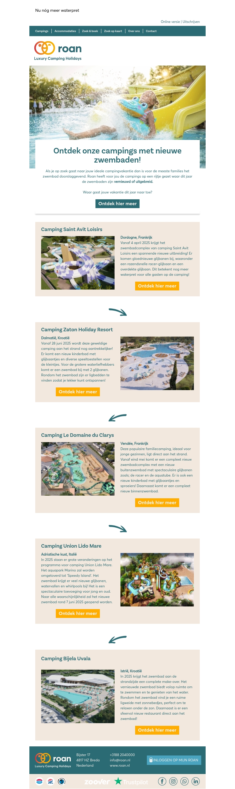 Ontdek de nieuwste zwembaden bij onze campings voor een onvergetelijke vakantie. Van Frankrijk tot Kroatië, onze locaties hebben avontuurlijke glijbanen en ontspannende waterparken. Ervaar de uitgebreide faciliteiten vanaf zomer 2025 en geniet van het ultieme waterplezier voor het hele gezin.