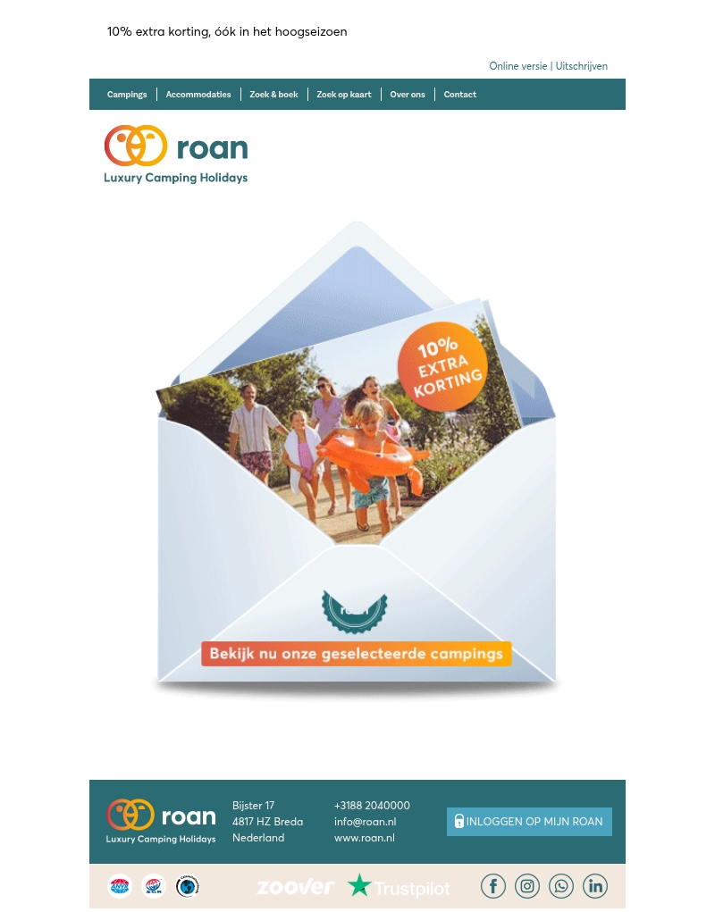 Geniet van de zon met Roan Luxury Camping Holidays. Ontvang 10% extra korting, zelfs in het hoogseizoen. Bekijk onze geselecteerde campings voor een onvergetelijke vakantie-ervaring. Boek nu en maak uw zomerse droom waar.