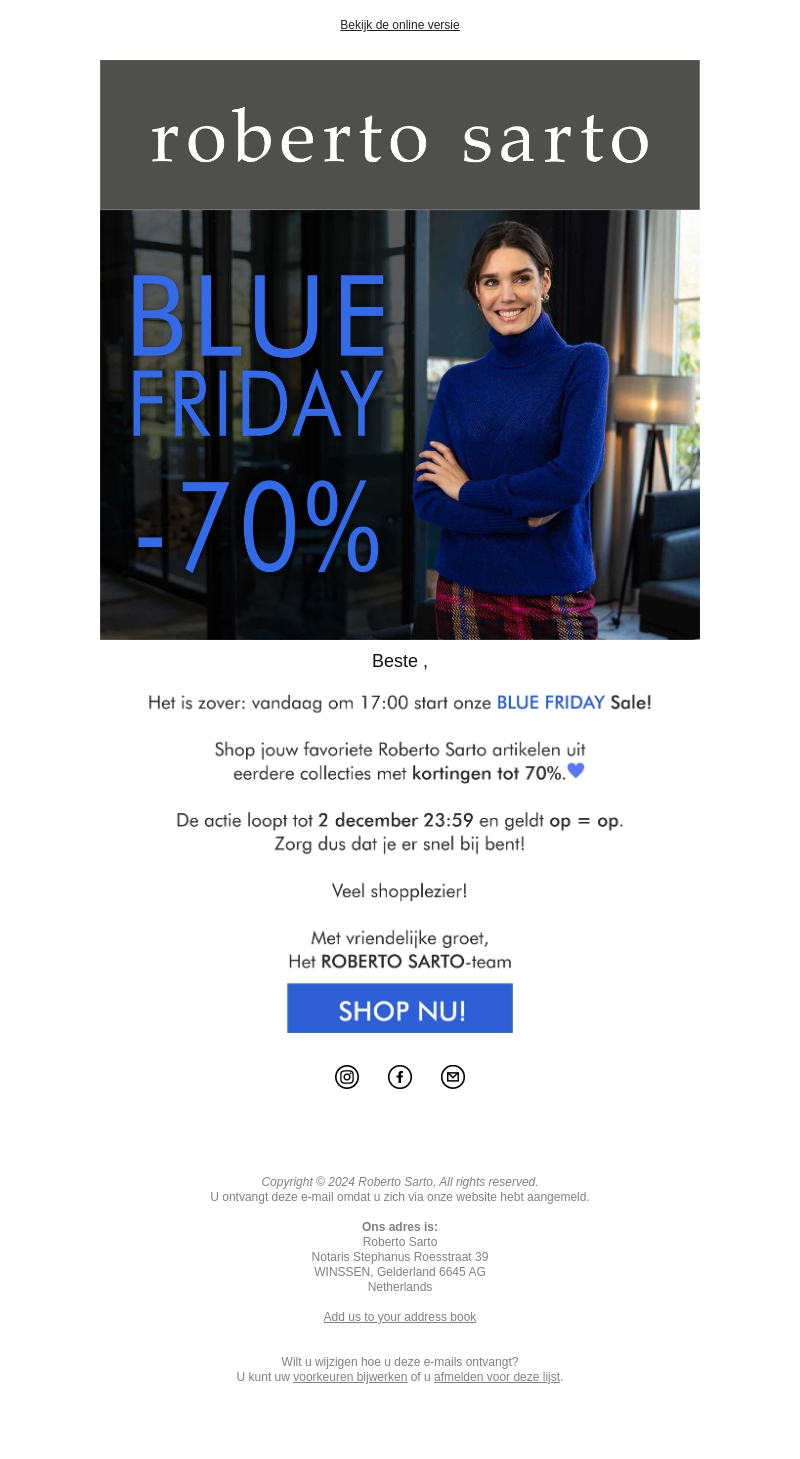 De Roberto Sarto Blue Friday Sale is begonnen! Geniet van kortingen tot 70% op jouw favoriete artikelen uit eerdere collecties. De actie duurt tot 2 december en geldt zolang de voorraad strekt. Zorg ervoor dat je er snel bij bent!