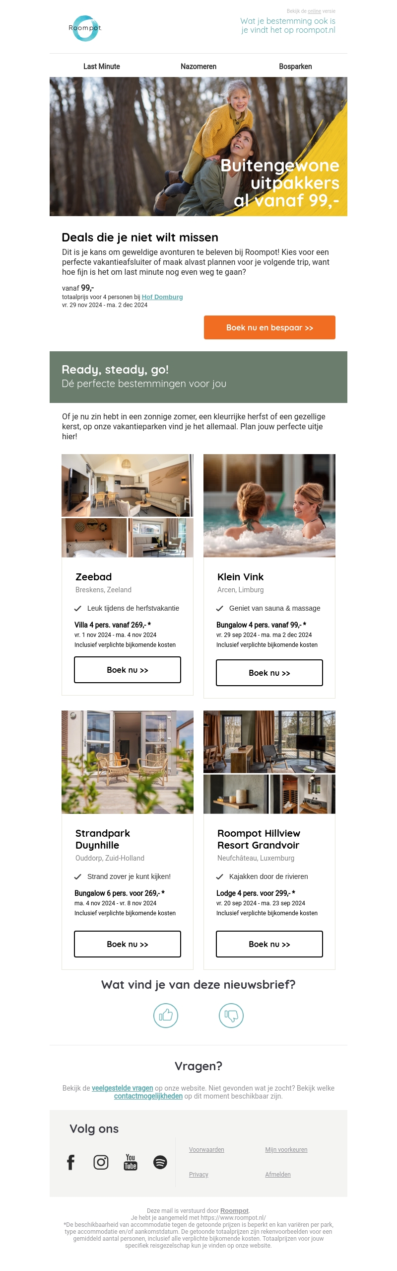 Dit is je kans om geweldige avonturen te beleven bij Roompot! Kies voor een perfecte vakantiesluiter of maak alvast plannen voor je volgende trip. Van zonovergoten zomers tot kleurrijke herfsten, vind je ideale uitje bij onze vakantieparken. Boek nu en bespaar!