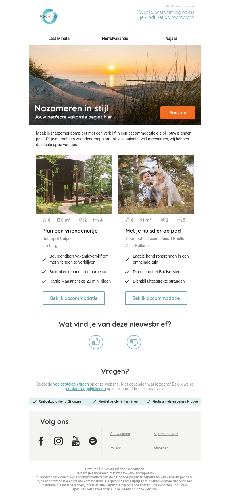 Maak je nazomer compleet met een stijlvol verblijf bij Roompot. Kies een accommodatie die bij je past en geniet van een heerlijk uitje met vrienden of je huisdier. Ontdek onze geselecteerde verblijven en maak jouw perfecte vakantie waar.