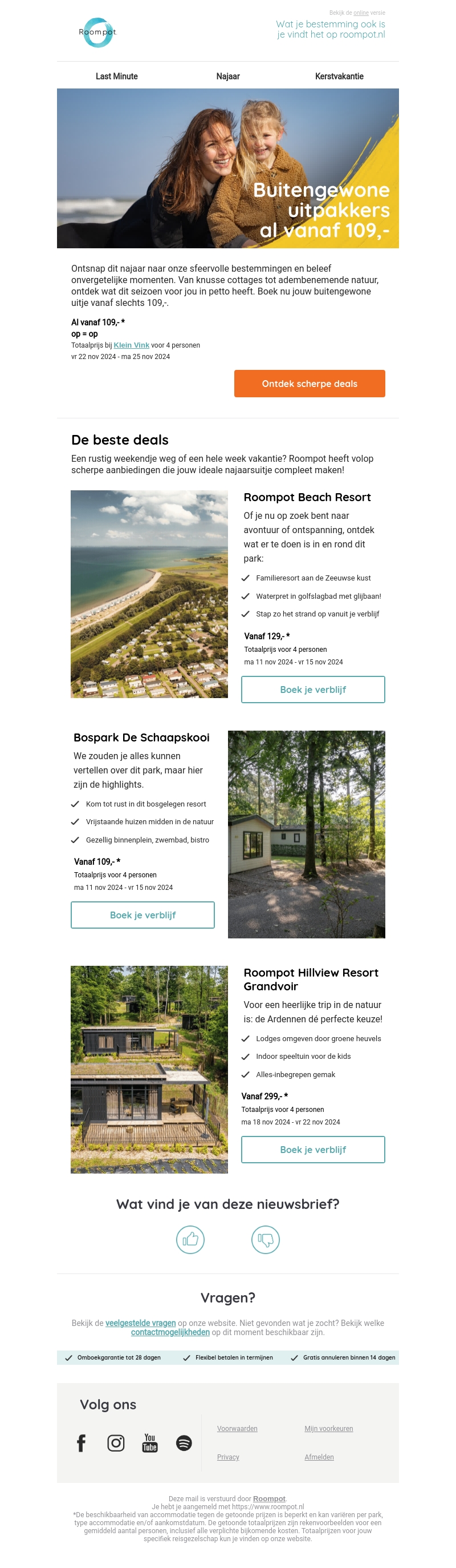 Ontsnap dit najaar naar unieke bestemmingen met onvergetelijke ervaringen bij Roompot. Geniet van knusse cottages, prachtige natuur en scherpe aanbiedingen. Boek je uitje vanaf slechts €109 en beleef de herfst op zijn best. Ruime keuze aan resorts voor avontuur en ontspanning. Mis de buitengewone uitpakkers niet!