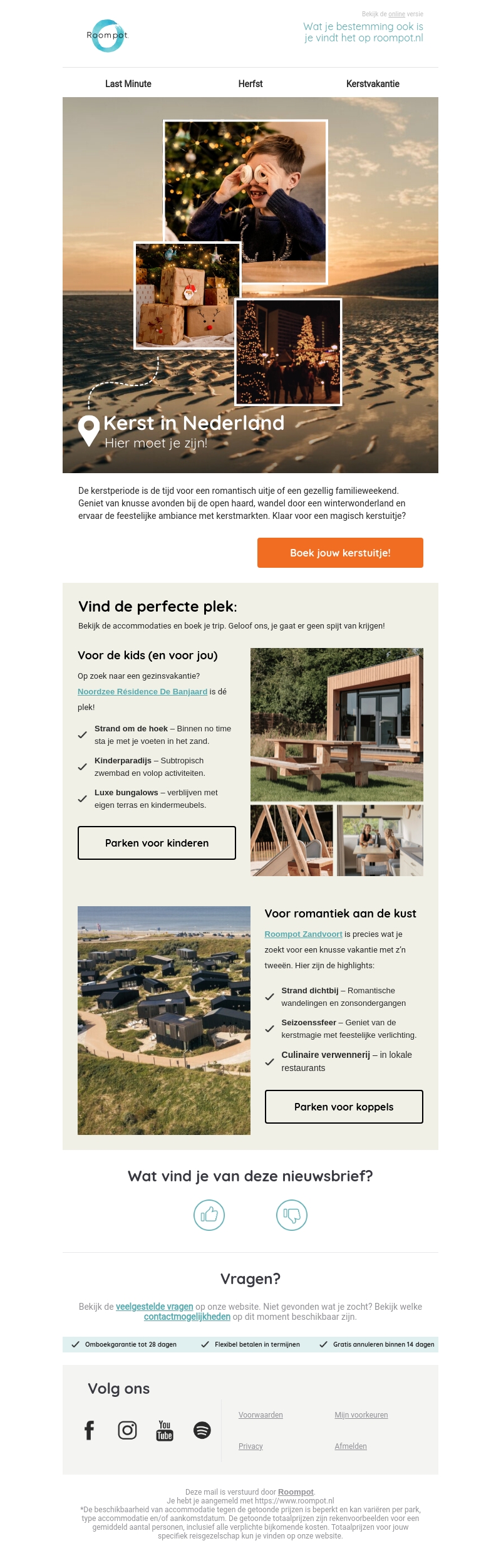 Ervaar de kerstsfeer tijdens een heerlijk verblijf in Nederland met Roompot. Geniet van romantiek of gezinsplezier aan de kust met speciale kerstmarkten en winterwonderland activiteiten. Boek nu je kerstuitje en beleef een onvergetelijke vakantie. Verblijf in luxe bungalows of kies voor kindvriendelijke parken.