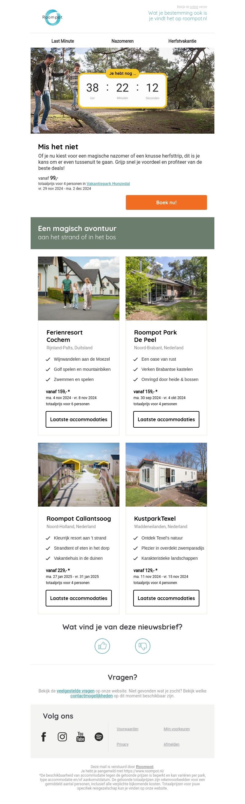 Of je nu kiest voor een magische nazomer of een knusse herfsttrip, dit is je kans om er even tussenuit te gaan. Boek nu voor fantastische aanbiedingen beginnend vanaf 99 euro. Ontdek accommodaties zoals Ferienresort Cochem en Roompot Park De Peel. Geniet van wijngemeenschappen, golfen, spelen, en nog veel meer.
