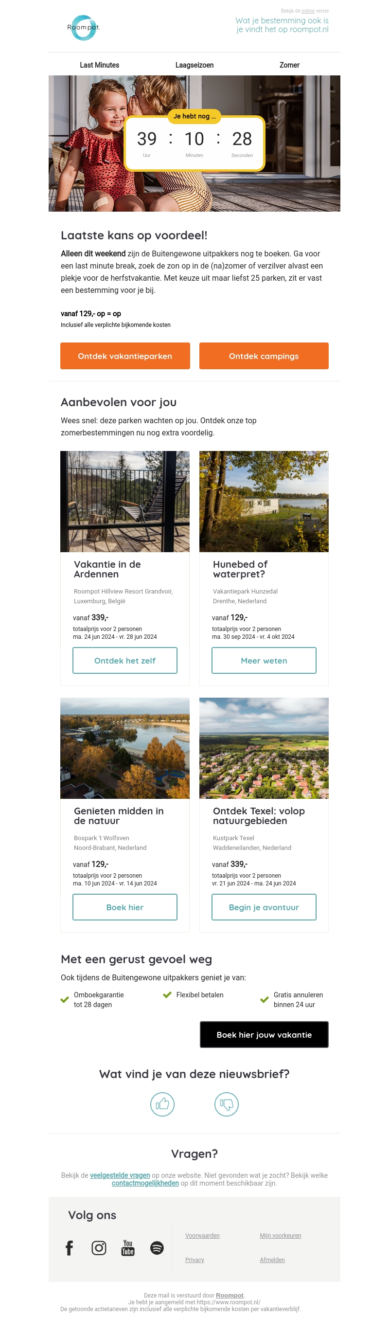 Ontdek nu de buitengewone uitpakkers tijdens het laatste weekend van deze aanbieding. Boek een last minute break, zoek de zon op in de (na)zomer of verzeker alvast een plek voor de herfstvakantie. Met keuze uit maar liefst 25 parken, zit er vast een bestemming voor je bij. Vanaf €129,-. Op = op.