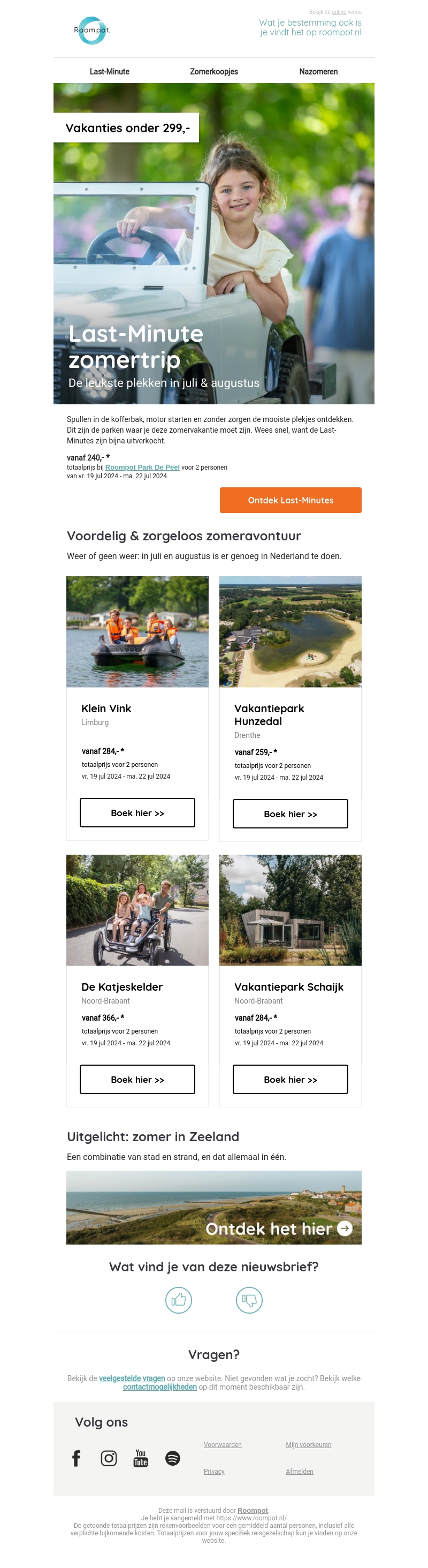 Vakanties onder €299: ontdek de leukste plekken in juli en augustus. Bekijk onze aanbiedingen voor last-minute zomervakanties en boek jouw ideale uitje. Wees snel, want de beschikbaarheid is beperkt. Perfect voor een zorgeloze zomeravontuur met Roompot!