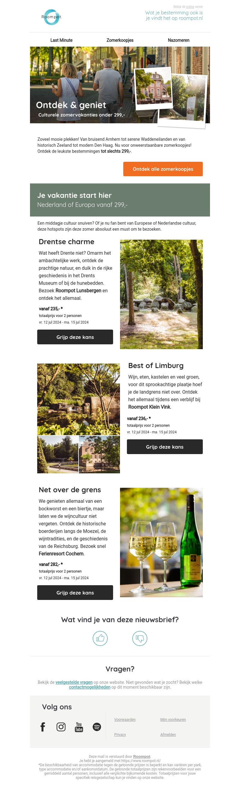 Zoveel mooie plekken om te ontdekken! Van het bruisende Arnhem tot de serene Waddeneilanden en van historisch Zeeland tot modern Den Haag. Ontdek de leukste bestemmingen voor slechts 299,- en geniet van een culturele zomervakantie.