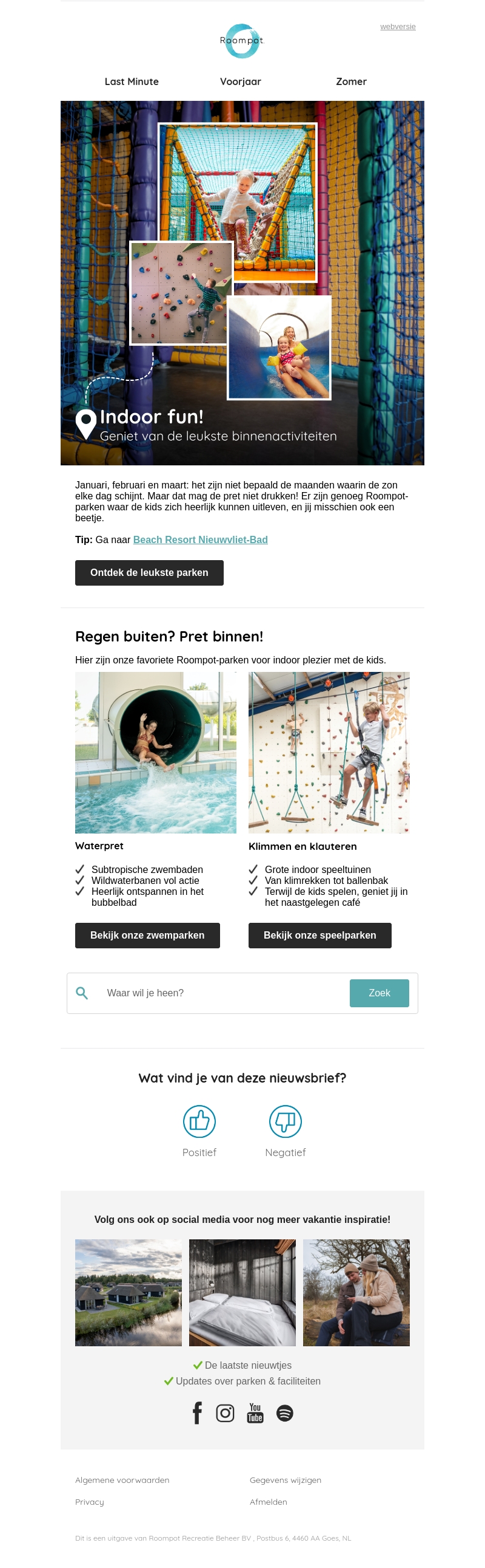 Maak regenachtige dagen leuk met Roompotβs indoor activiteiten. Onze parken bieden een scala aan mogelijkheden voor waterpret en klimavonturen, zodat de kinderen zich geen moment vervelen. Dankzij onze grote speelhallen en zwembaden is plezier gegarandeerd. Ontdek onze parken nu en geniet samen van een dag vol plezier.