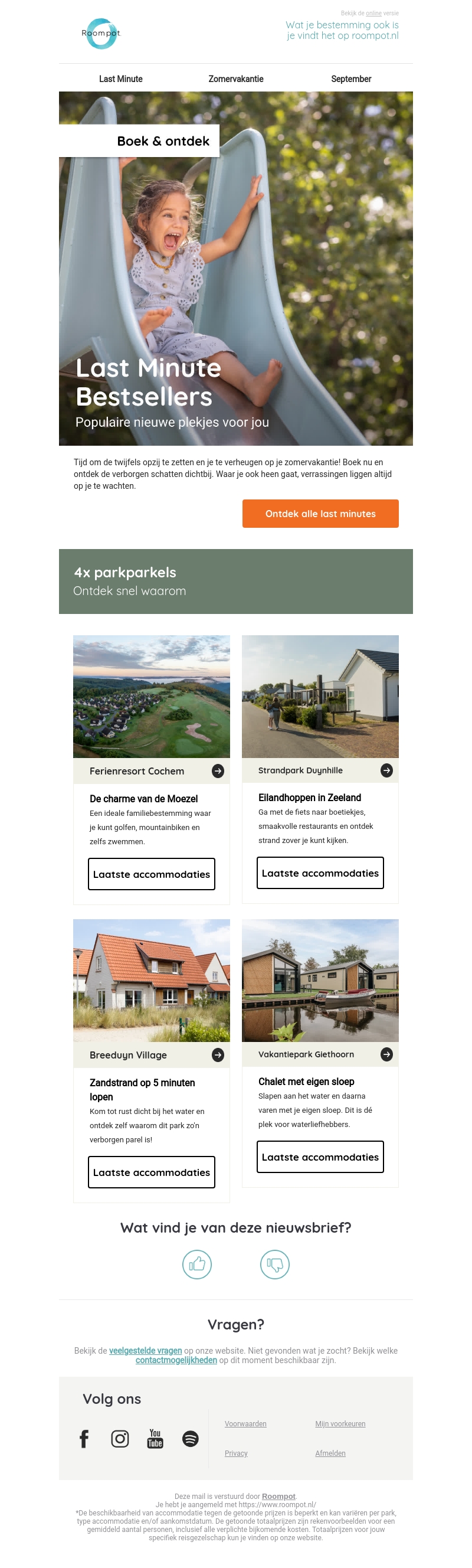 Tijd om je zomervakantie te plannen met onze unieke last minute aanbiedingen. Ontdek verborgen pareltjes in prachtige parken en beleef een onvergetelijke vakantie. Of je nu houdt van stranden, bossen of gezellige dorpjes, we hebben iets voor jou!