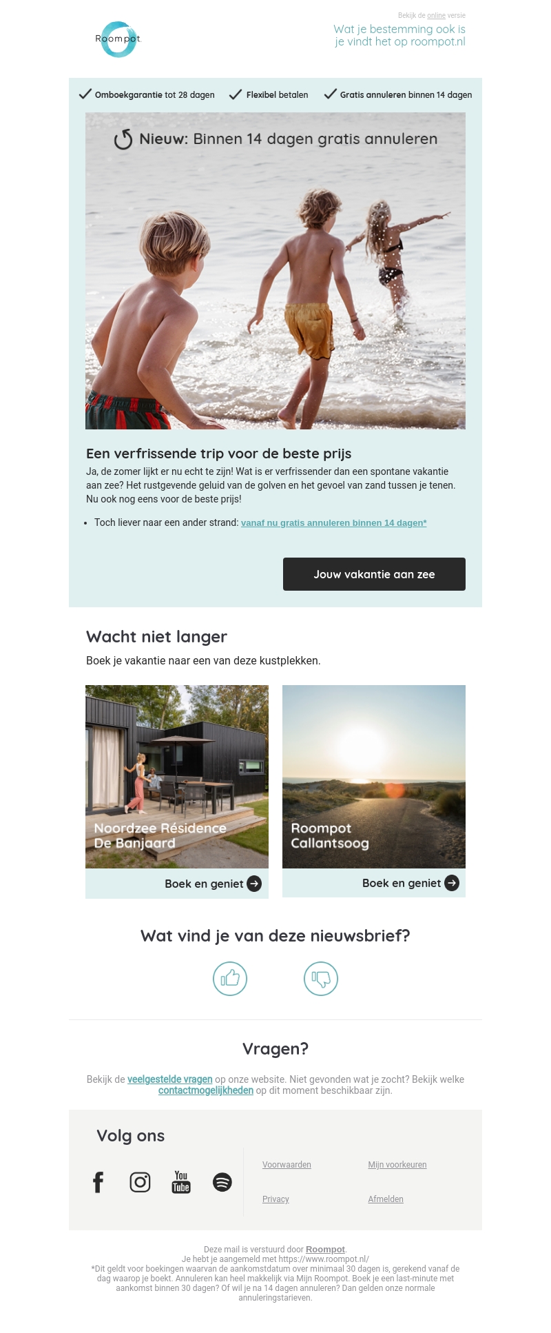Zomer is hier! Ontsnap naar een van onze kustlocaties voor een verfrissende vakantie. Boek nu met voordelen zoals gratis annulering binnen 14 dagen. Ontdek Noordzee RΓ©sidence De Banjaard of Roompot Callantsoog.