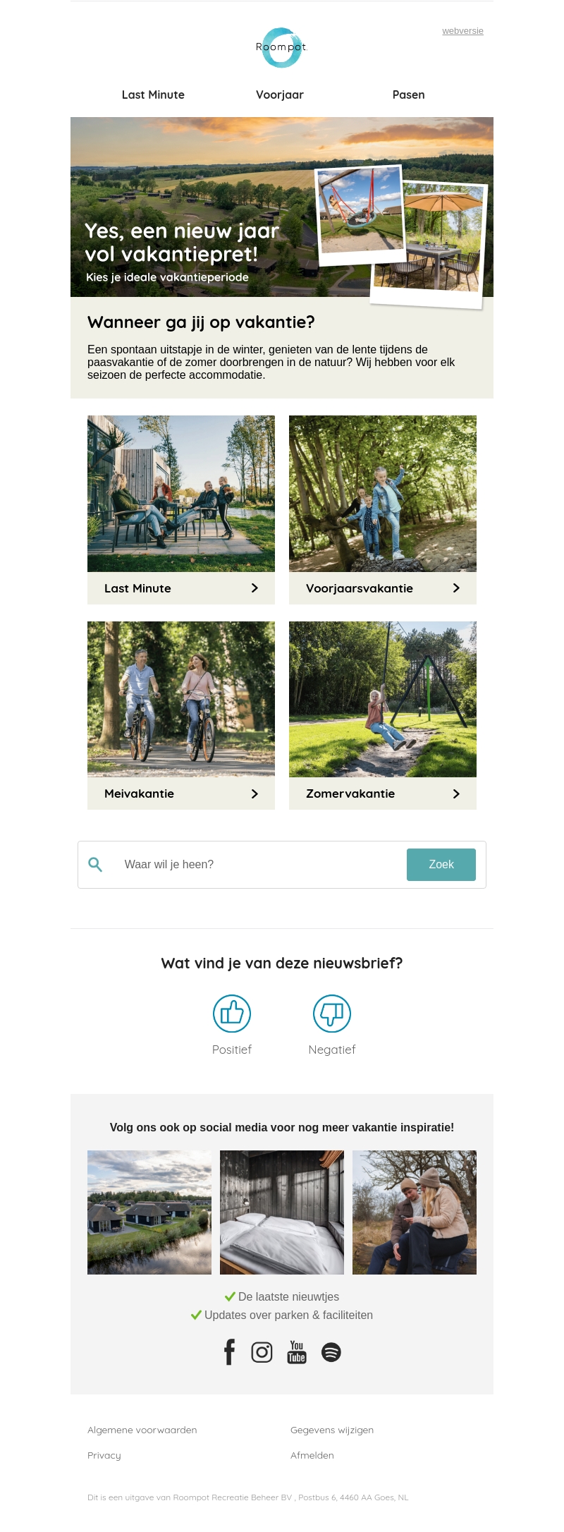 Beleef een nieuw jaar vol vakantieplezier met Roompot. Of je nu in de winter, lente, of zomer eropuit wilt, wij hebben voor elk seizoen de ideale plek. Ontdek onze last-minute deals en geniet van een geweldige vakantie. Kies uit tal van bestemmingen en ervaar de natuur op zijn best. Boek vandaag nog jouw droomvakantie. Roompot staat klaar om je te verwelkomen!
