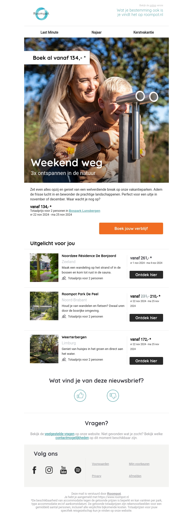 Ontsnap aan de dagelijkse drukte met een weekendje weg bij Roompot. Met prijzen vanaf €134 kun je genieten van een ontspannen verblijf in de natuur. Kies uit verschillende vakantieparken en laat je verrassen door de prachtige landschappen. Perfect voor een uitje in november of december. Mis deze kans niet om even helemaal tot rust te komen.