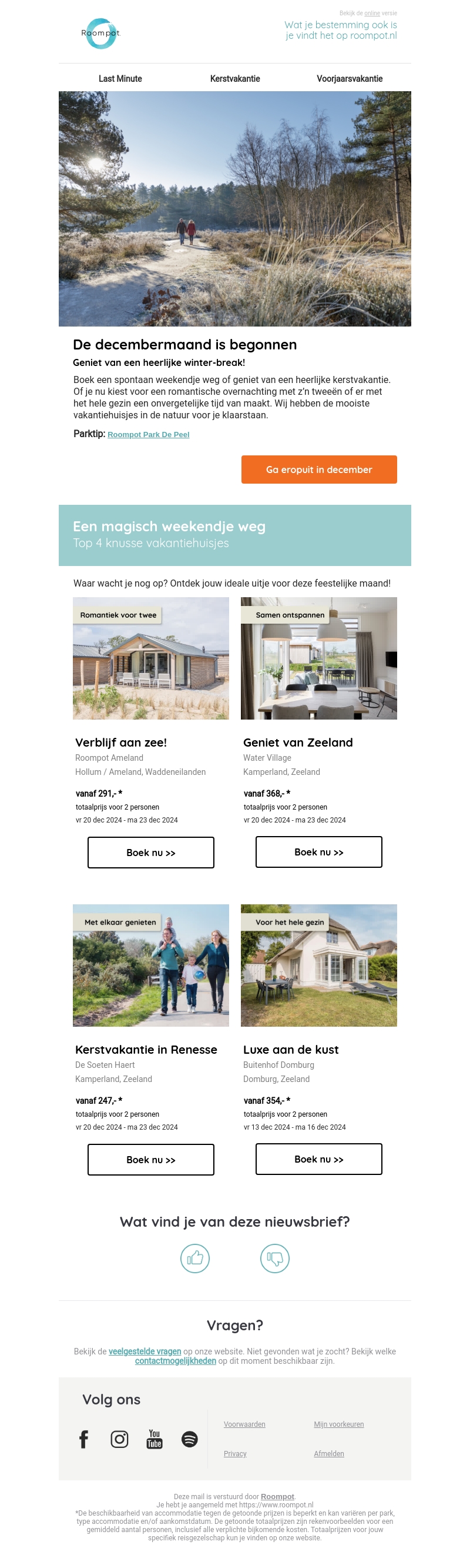 De decembermaand brengt betoverende mogelijkheden voor een onvergetelijk weekendje weg. Verken romantische en gezellige vakantiebestemmingen met Roompot. Of je nu kiest voor de kust of de natuur, er is voor ieder wat wils. Plan jouw winterbreak en ontdek de charme van Zeeland en Renesse.