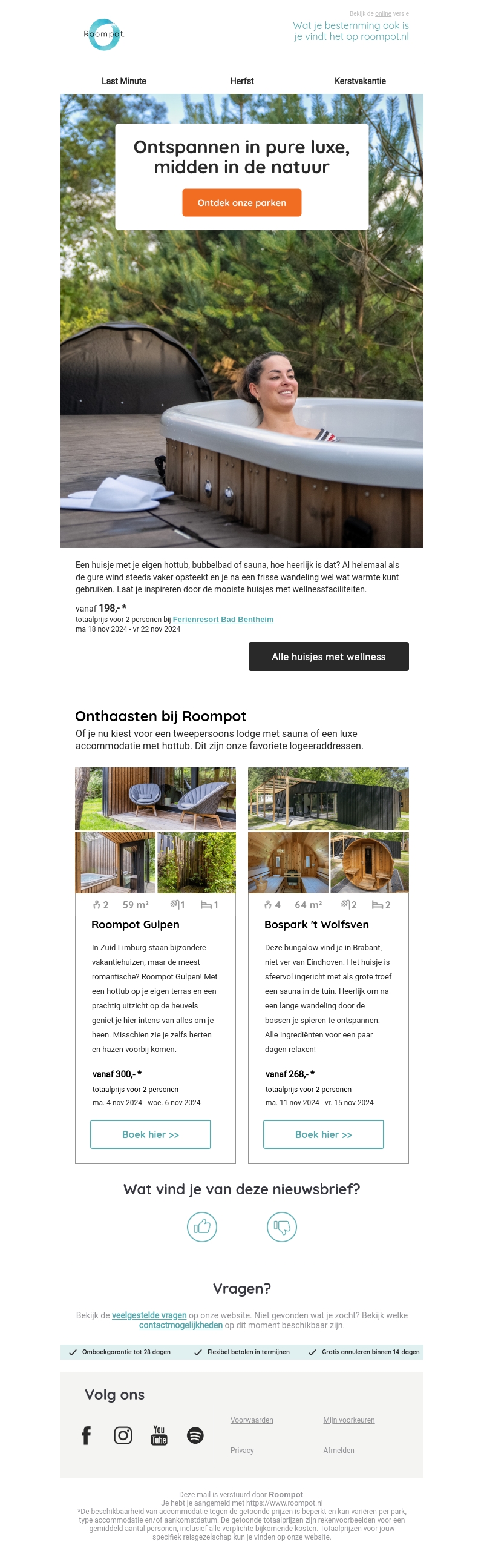 Geniet van pure ontspanning in een huisje met hottub, sauna of bubbelbad bij Roompot. Ontdek prachtige locaties zoals Ferienresort Bad Bentheim en Bospark 't Wolfsven. Perfect voor een ontspannen herfstvakantie.