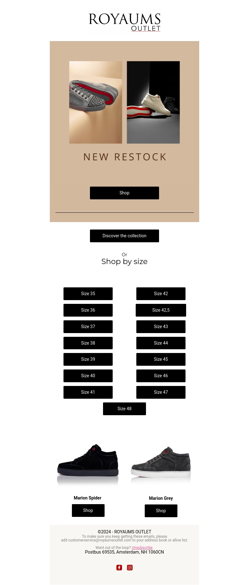 Royaus Outlet presenteert trots hun nieuwe voorraad exclusieve schoenen. Ontdek de stijlvolle en comfortabele Marion Spider en Marion Grey modellen. Beschikbaar in alle maten van 35 tot 48. Ervaar luxe en kwaliteit, speciaal voor jou op voorraad. Shop nu en vindt jouw perfecte paar!
