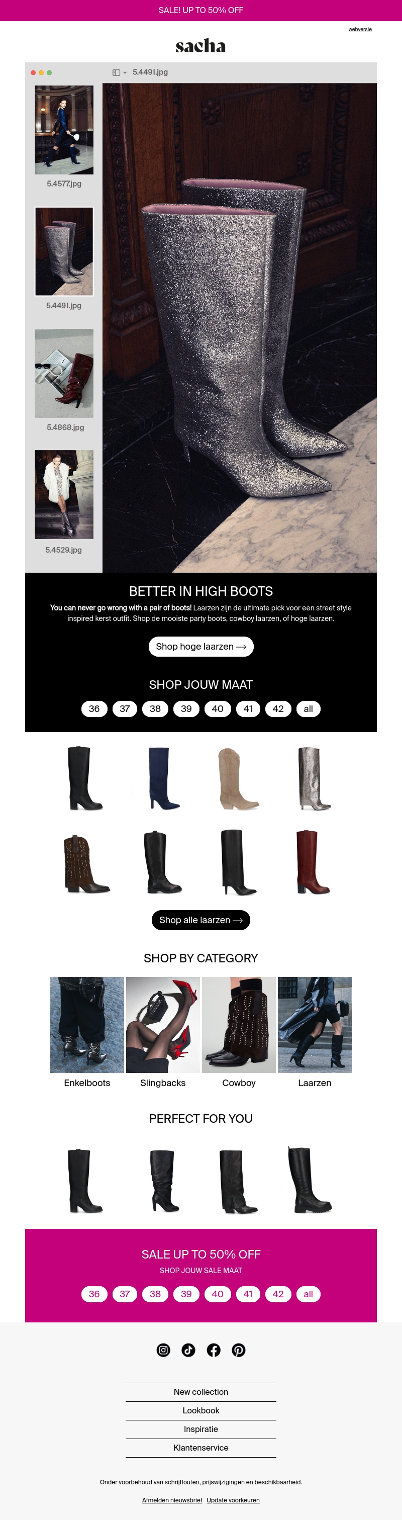 Verken onze collectie hoge laarzen, geschikt voor elke gelegenheid. Of je nu op zoek bent naar glinsterende party boots of stoere cowboy laarzen, wij hebben de juiste keuze voor je. Profiteer nu van de SALE tot 50% korting!