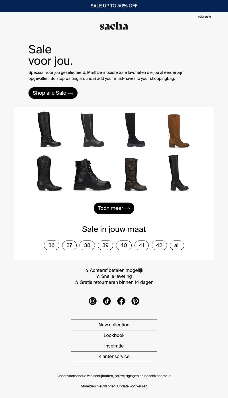Geniet van de laatste sale aanbiedingen bij Sacha met kortingen tot wel 50%. Of je nu op zoek bent naar stijlvolle laarzen of modieuze schoenen, er is voor ieder wat wils. Mis deze kans niet om je favorieten met korting te scoren. Maak snel je keuze en upgrade je garderobe! Achteraf betalen en snelle levering mogelijk.