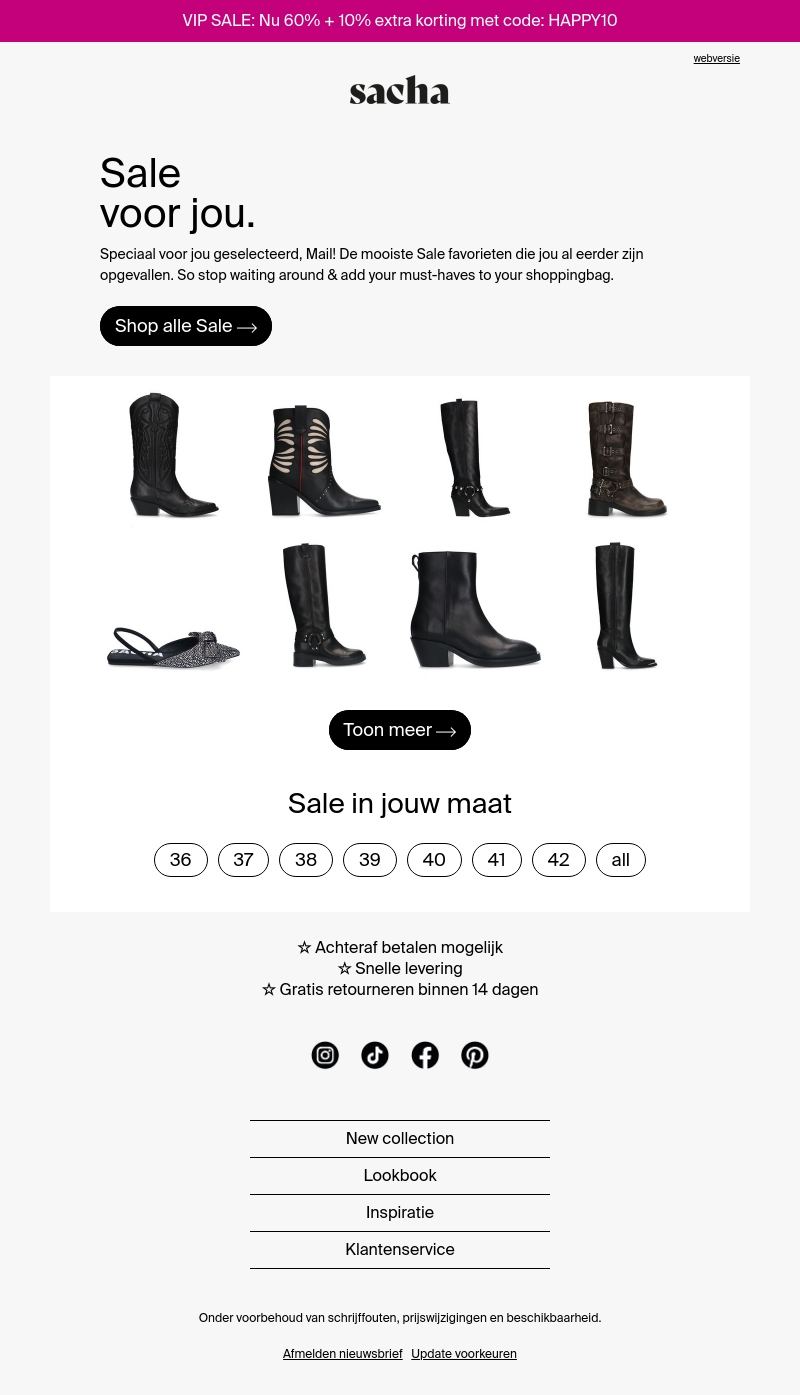 Duik in de luxe van Sacha's VIP Sale met fantastische aanbiedingen op je favoriete schoenen. Ontvang nu tot 60% korting, plus een extra 10% met de couponcode HAPPY10. Verwacht een schitterend assortiment, speciaal voor jou geselecteerd. Mis je kans niet om je garderobe aan te vullen met deze stijlvolle must-haves. Snel bestellen, snel geleverd en gratis binnen 14 dagen retour.