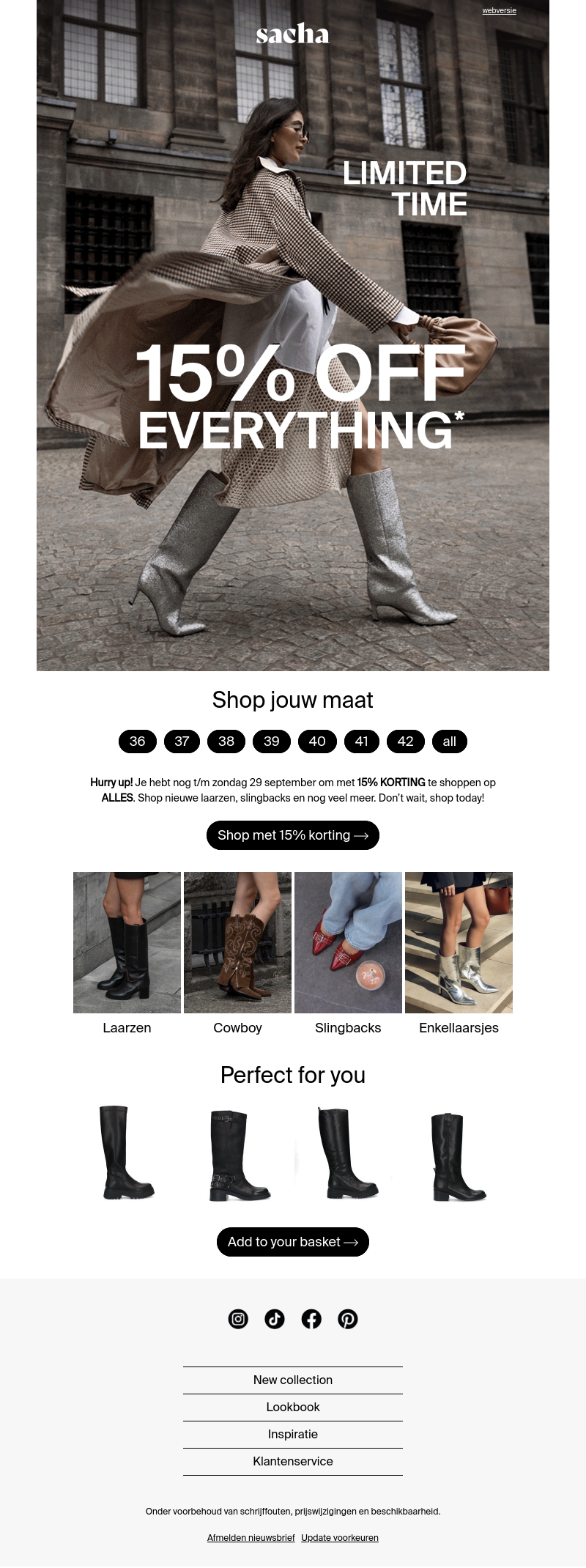 Ontvang nu 15% korting op ALLES bij Sacha. Mis deze kans niet om jouw favoriete laarzen, cowboy boots, slingbacks en enkellaarsjes te kopen. De actie loopt tot en met zondag 29 september, dus wees er snel bij!