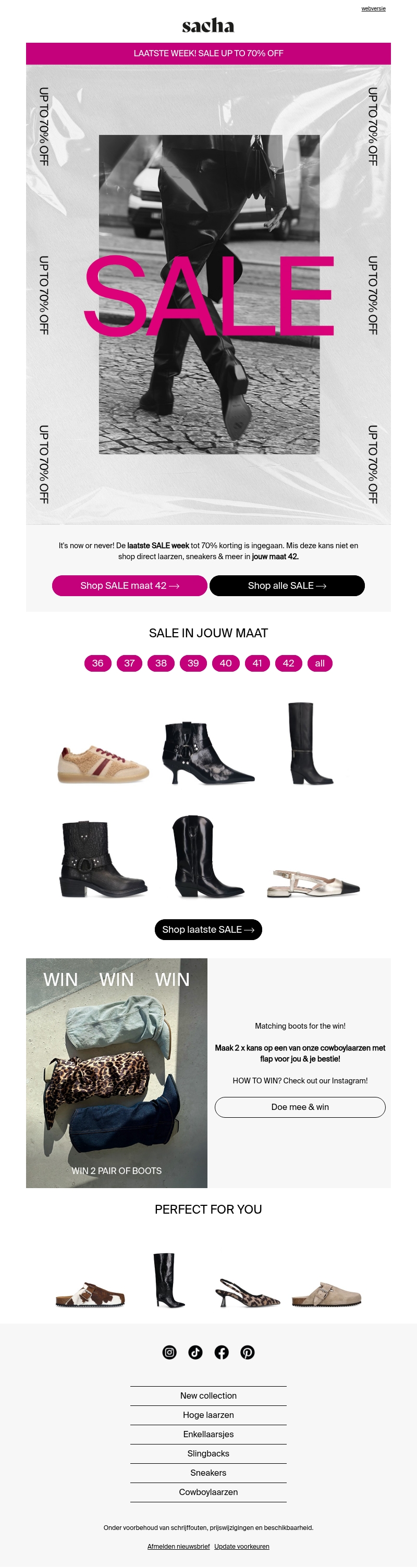 Het is de laatste kans om te profiteren van kortingen tot wel 70% op een breed scala aan schoenen. Of je nu op zoek bent naar laarzen, sneakers, of sandalen, deze sale heeft het allemaal. Ontdek jouw maat in onze exclusieve selectie en shop snel voordat het te laat is. Maak ook kans om twee paar boots te winnen! Bezoek onze Instagram voor meer informatie en doe mee.