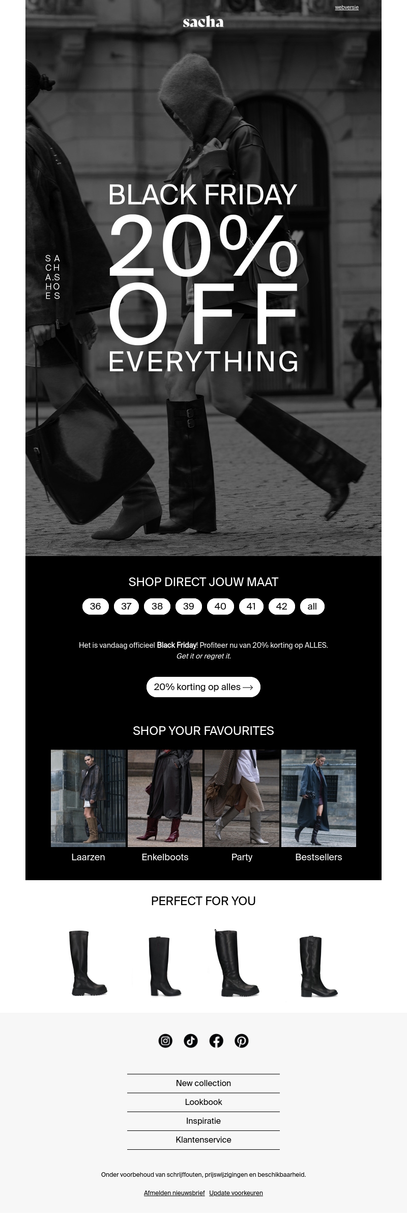 Ontdek de ultieme Black Friday deals bij Sacha! Shop nu met 20% korting op al je favoriete items, van laarzen tot feestelijke enkellaarzen. Mis deze kans niet om je garderobe aan te vullen. Geldig voor een beperkte tijd, tot de voorraad strekt. Begin vandaag nog met shoppen en geniet van geweldige besparingen.