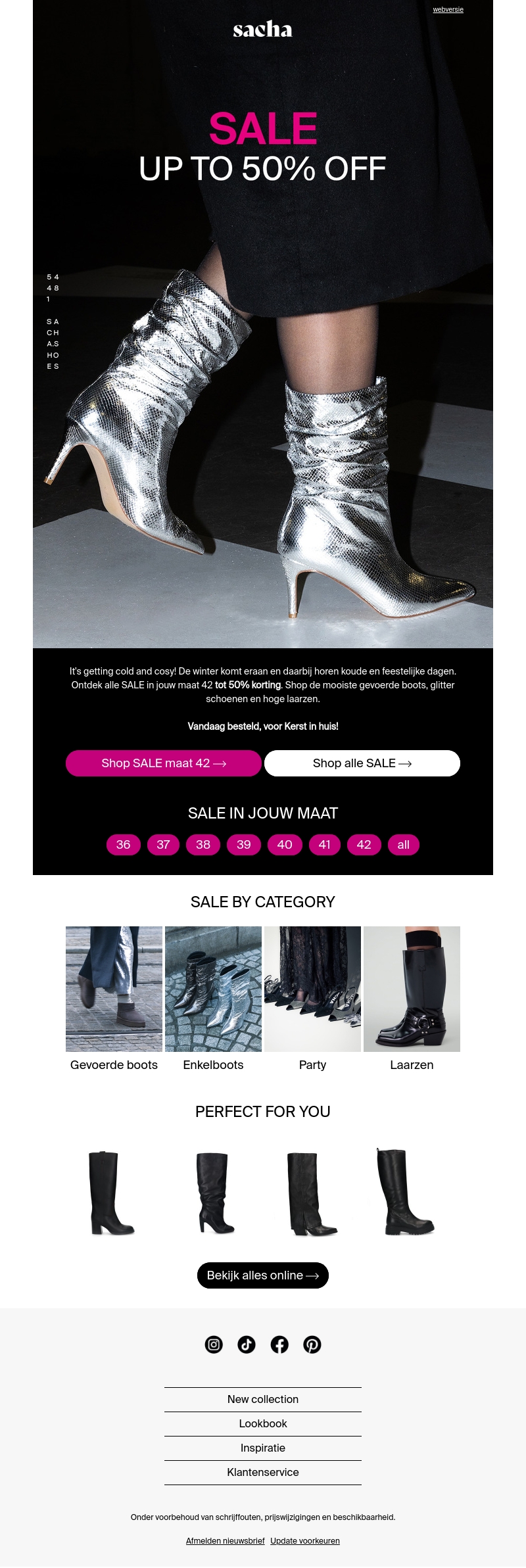 Bereid je voor op de winter met de stijlvolle sale van Sacha. Ontdek kortingen tot 50% op schoenen in jouw maat 42. Van stijlvolle gevoerde boots tot glitterende party schoenen en hoge laarzen. Bestel vandaag nog en ontvang je favorieten op tijd voor Kerst. Mis deze unieke kans niet om je garderobe bij te werken.