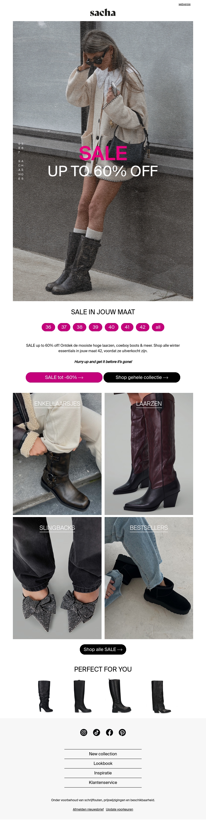 Grote uitverkoop bij Sacha met kortingen tot 60%! Ontdek hoge laarzen, cowboy boots en meer. Shop jouw ideale paar in de gewenste maat voordat ze uitverkocht zijn. Mis het niet, want op=op! Haal het beste uit de wintermode.