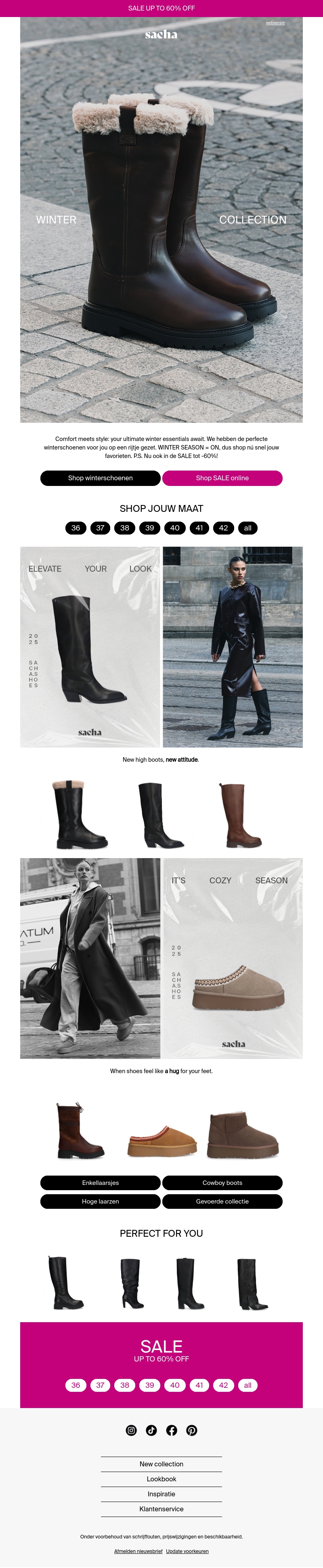 Ontdek de nieuwste wintercollectie van Sacha. Van trendy hoge laarzen tot comfortabele gevoerde schoenen, er is voor ieder wat wils. Profiteer nu van kortingen tot wel 60%! Maak je klaar voor de winter met de perfecte combinatie van stijl en comfort.