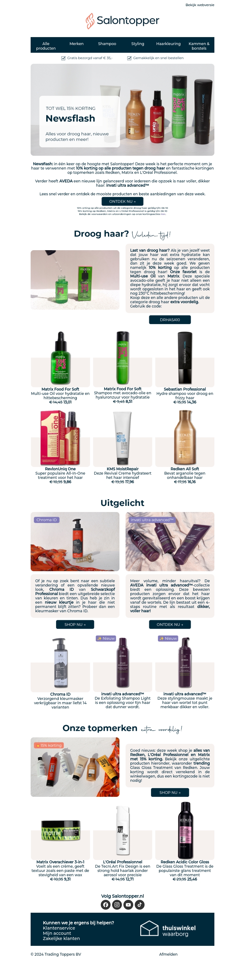 Deze week biedt Salontopper tot 15% korting op een breed scala aan haarverzorgingsproducten, waaronder topmerken als Redken en Matrix. Speciaal voor mensen met droog haar zijn er exclusieve deals en nieuwe lijnen gelanceerd. Mis niet onze nieuwste producten en blijf up-to-date met de beste haarverzorgingstips. Bekijk onze aanbevolen producten en profiteer van deze weekaanbiedingen!