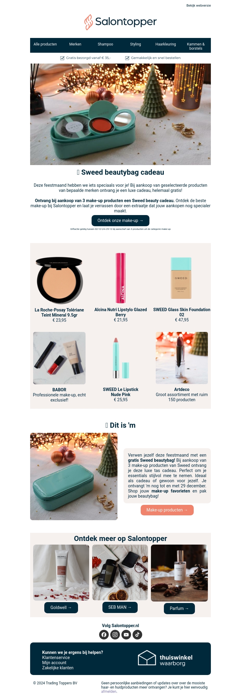 Ontdek deze feestmaand een speciale aanbieding bij Salontopper. Bij aankoop van drie make-up producten ontvang je een gratis Sweed beautybag. Het stijlvolle cadeau voor al jouw make-up essentials. Verwen jezelf of geef het cadeau. Deze promotie is geldig tot en met 29 december. Mis deze kans niet op een extraatje tijdens je aankopen!