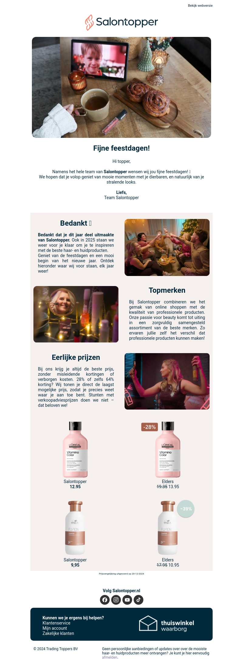 Namens Salontopper wensen wij je fijne feestdagen. Geniet van de mooiste momenten met je dierbaren en ontdek ons assortiment aan topmerken voor stralende looks. Bij ons vind je eerlijke prijzen en professionele producten zonder verborgen kosten.