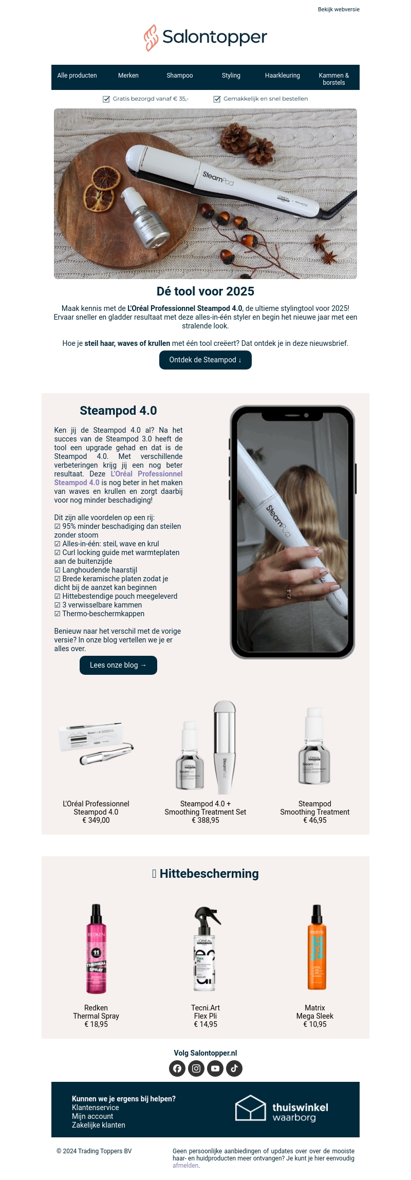 Maak kennis met de Steampod 4.0, de ultieme stylingervaring voor 2025. Deze alles-in-één tool biedt sneller en gladder resultaat, met minder beschadiging aan je haar. Of je nu steil, golvend of krullend haar wilt creëren, de Steampod 4.0 maakt het mogelijk. Ideaal voor het nieuwe jaar!
