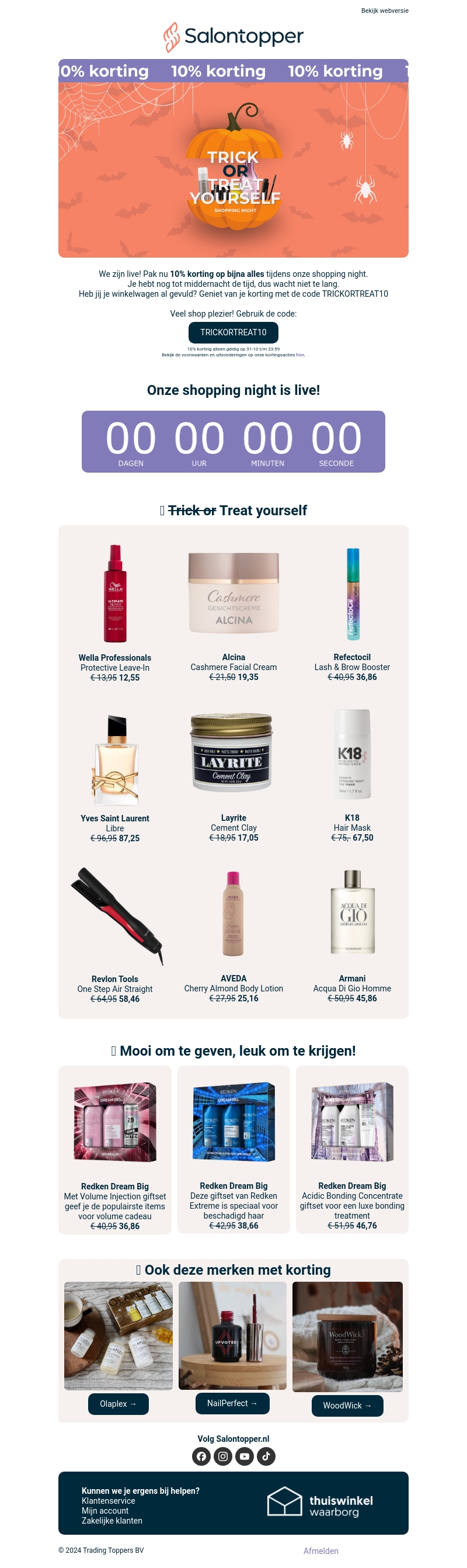 We zijn live met onze Shopping Night en bieden 10% korting op bijna alles! Vul je winkelwagen en gebruik de code TRICKORTREAT10 om te profiteren van de aanbieding. Deze spectaculaire nacht is perfect om jezelf te verwennen met topmerken. Wees er snel bij, want dit is een tijdelijke aanbieding. Ontdek de nieuwste producten en geniet van exclusieve kortingen.