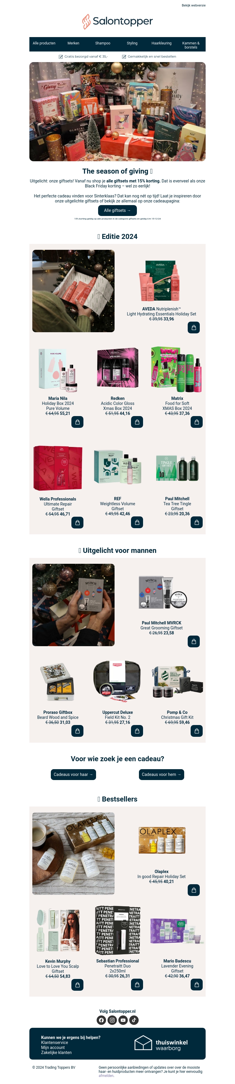 Het is de tijd van geven! Geniet nu van 15% korting op alle giftsets bij Salontopper. Of je nu op zoek bent naar een cadeau voor hem of haar, er is voor ieder wat wils. Verwen je dierbaren met topmerken zoals AVEDA, Redken, en meer. Mis deze kans niet om extra te besparen tijdens het feestseizoen. Ontdek nu de aanbiedingen en maak je klaar om te stralen.