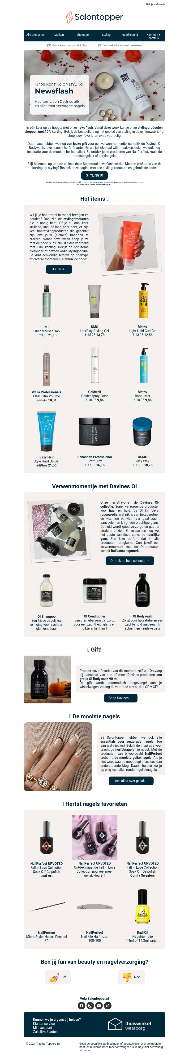 Deze week biedt Salontopper een spectaculaire korting van 10% op diverse stylingproducten. Mis de kans niet om een Davines gift te ontvangen bij je aankoop. Verken ook onze selectie van prachtige nail art designs die perfect passen bij het herfstseizoen.