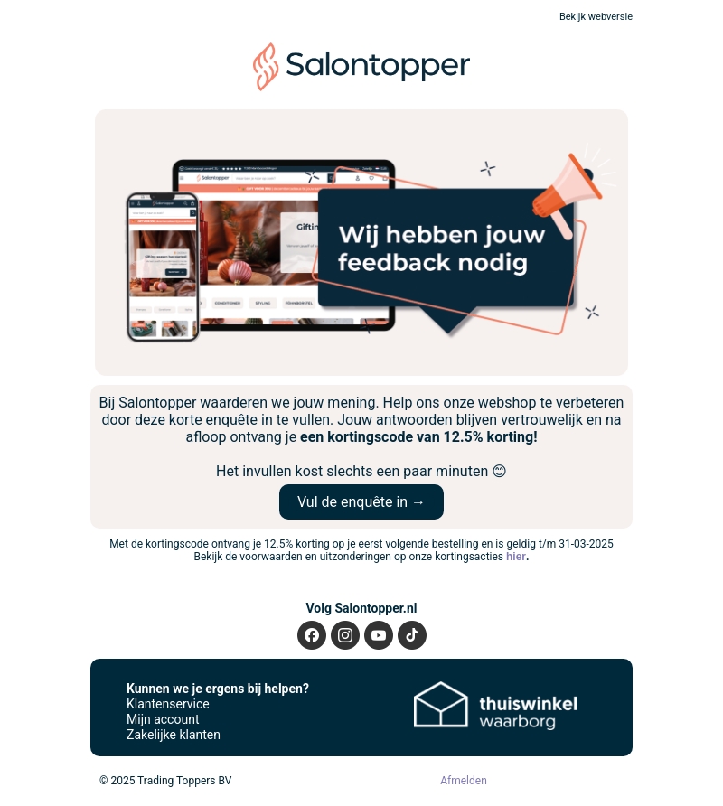 Salontopper vraagt om jouw feedback om hun webshop te verbeteren. Door een korte enquete in te vullen, help je niet alleen de klantenervaring te verbeteren, maar ontvang je ook een korting van 12.5% op je volgende bestelling. Het invullen duurt slechts enkele minuten. Grijp deze kans om je gedachtes te delen en te besparen.