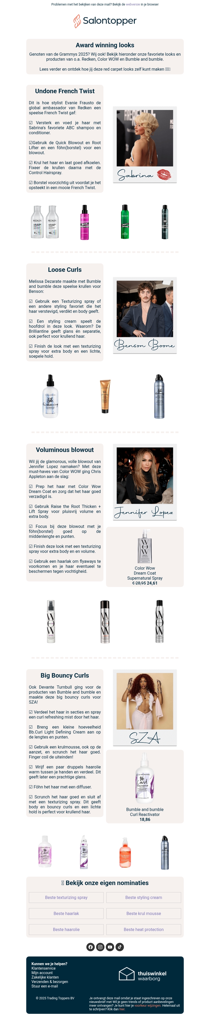 Het Grammy-seizoen van 2025 bracht adembenemende kapsels naar de rode loper. Ontdek hoe je zelf deze award-winnende looks kunt creëren met topproducten van Redken, Color WOW en Bumble and Bumble. Van Franse vlechten tot volumineuze blowouts, laat je inspireren door de creaties van beroemde hairstylisten als Evani Frausto en Devante Turnbull. Grijp je kans om deze glamoureuze stijlen na te bootsen vanuit het comfort van je eigen huis.