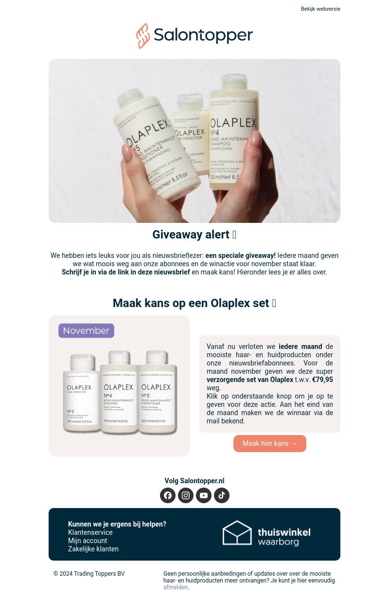 Doe mee met onze maandelijkse giveaway exclusief voor nieuwsbrieflezers. Deze maand maak je kans op een complete Olaplex set ter waarde van €79,95. Mis deze kans niet om jouw haarverzorgingsroutine te upgraden met premium producten. Schrijf je in via de nieuwsbrief en wie weet win jij deze fantastische set!