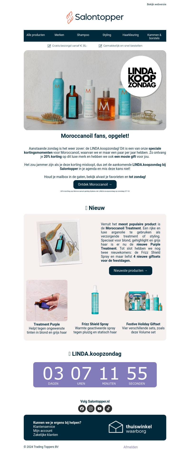 Deze zondag is het LINDA.koopzondag bij Salontopper! Dit betekent unieke kortingsmomenten voor Moroccanoil liefhebbers, met 20% korting op al je favoriete producten. Ontdek de nieuwe Purple Treatment en Frizz Shield Spray, perfect voor de feestdagen. Zorg dat je dit niet mist!