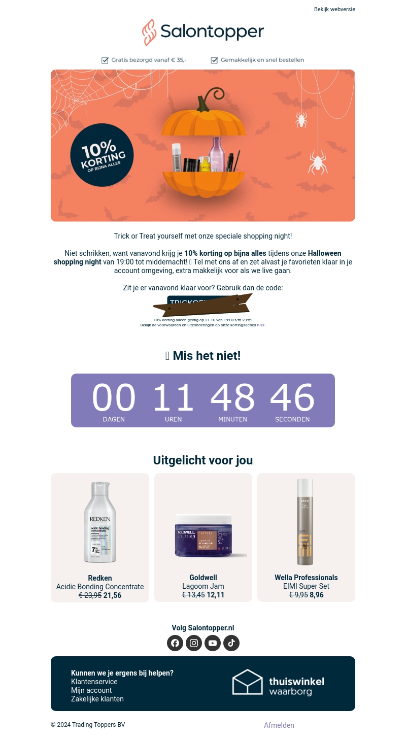 Mis onze speciale Halloween Shopping Night niet! Geniet van 10% korting op bijna alles van 19:00 tot middernacht. Bereid je favorieten alvast voor en gebruik de code TRICK. Zorg dat je klaar bent voor een magische avond vol verrassingen!