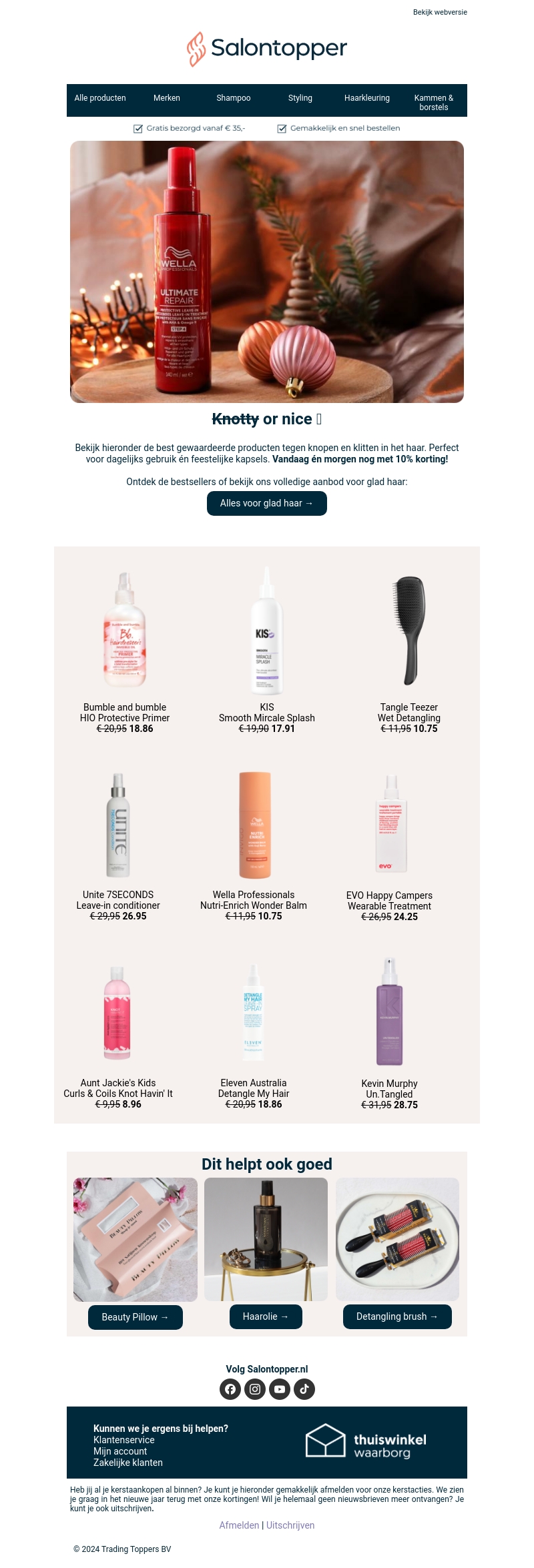 Deze nieuwsbrief van Salontopper introduceert top haarverzorgingsproducten die knopen en klitten bestrijden. Perfect voor dagelijks gebruik en feestelijke kapsels. Profiteer vandaag en morgen van 10% korting op deze hoogwaardige producten die ervoor zorgen dat je haar altijd glad en gezond blijft.