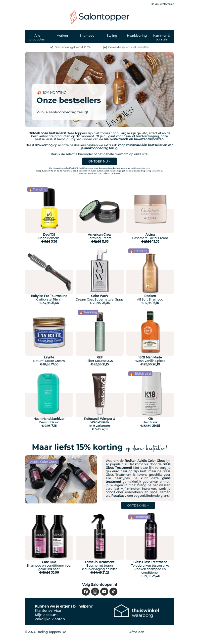 Ontdek de populaire producten van Salontopper met 10% korting. Of je nu gaat voor haarverzorging, styling of huidverzorging, er is voor ieder wat wils. Mis deze kans niet om iets nieuws te proberen en misschien je aankoopbedrag terug te winnen. Koop nu voor minimaal €60 en maak automatisch kans. De winnaar wordt snel bekendgemaakt na de actieperiode.