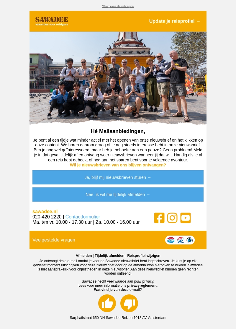 Blijf op de hoogte met Sawadee's nieuwsbrief vol spannende reisupdates. Herinner jezelf aan waarom reizen belangrijk is en ontdek hoe je kunt profiteren van exclusieve aanbiedingen. Je kunt je altijd opnieuw inschrijven om niets te missen.